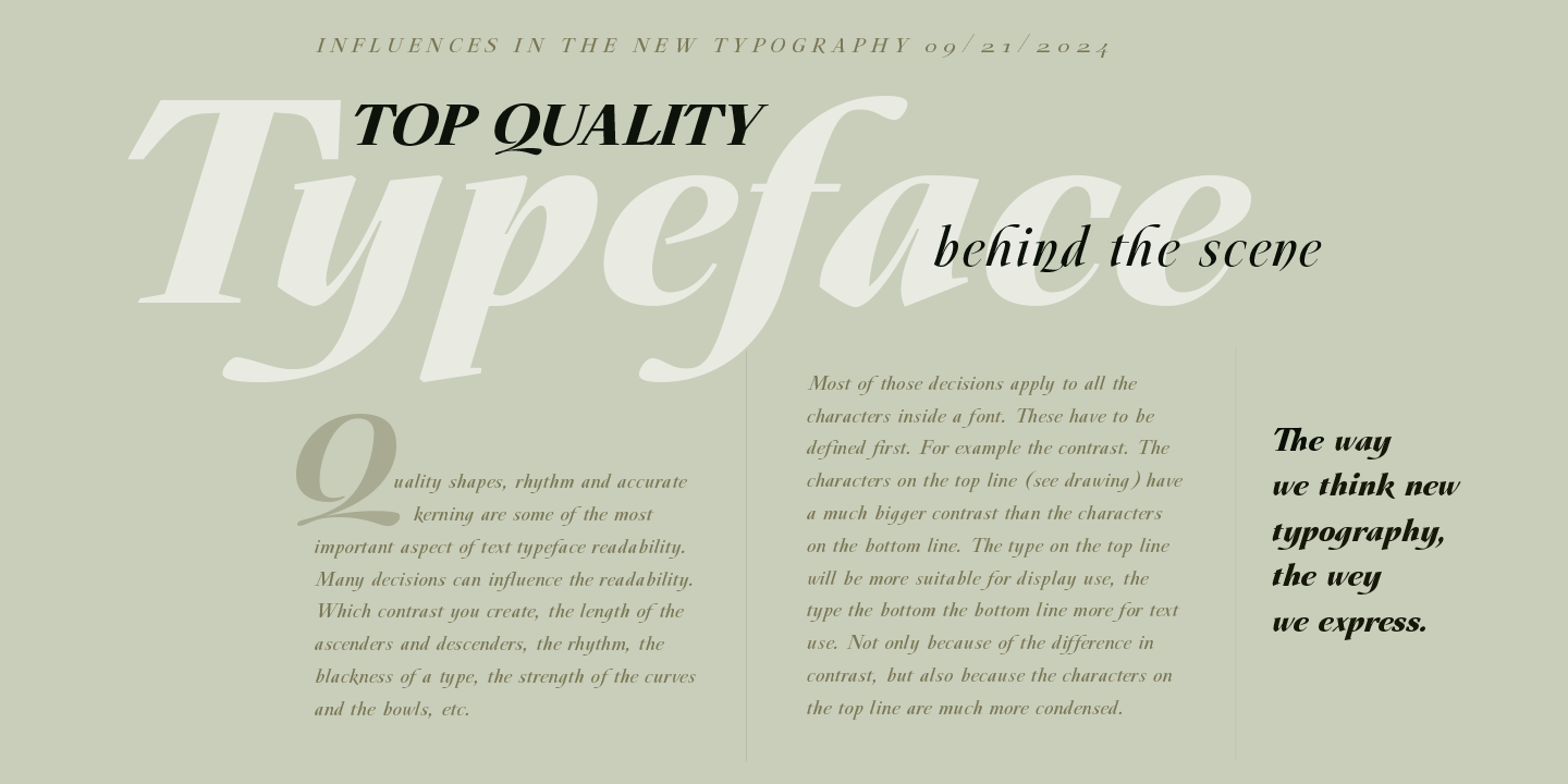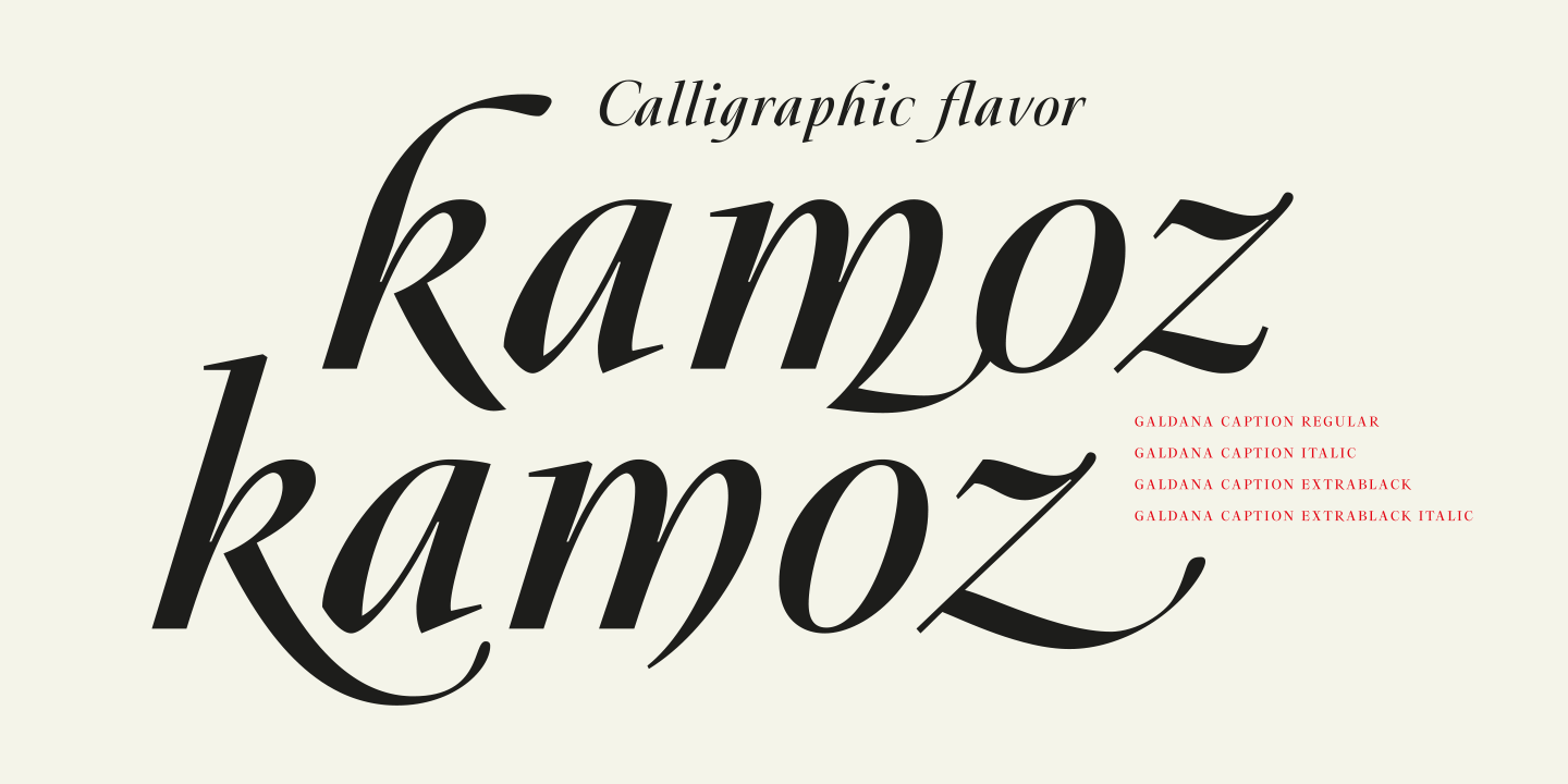 The family, Galdana Caption is a specialized subfamily designed for headlines, lead text, and primary typographic roles, as well as for seamless combination with Galdana Text. The Caption family includes four styles: Regular, Italic, Fat, and Fat Italic. Its italics preserve the signature 17-degree slant, combined with shorter ascenders and descenders, delivering a compact structure and a dynamic calligraphic flavor ideal for display use and tighter layouts.